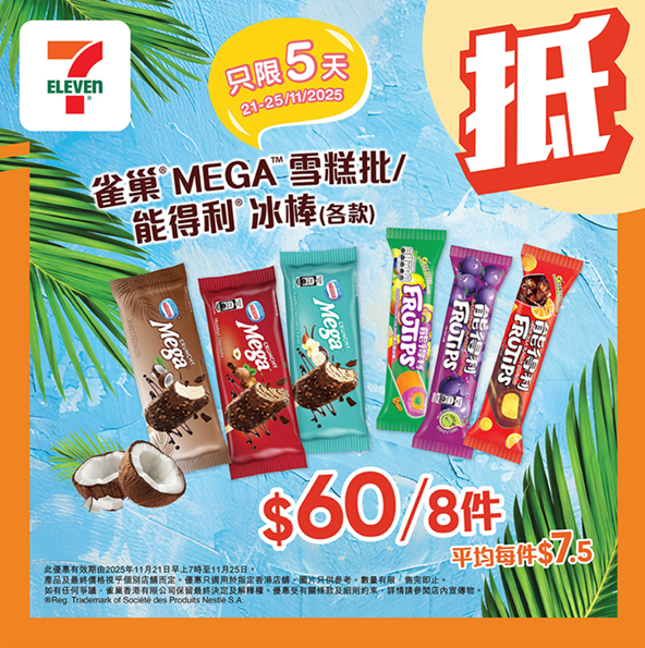 ⭐優惠有效期由2025年11月21日早上7時至11月25日。優惠只適用於香港店舖。部分貨品只限於指定店舖提供。貨品數量有限,售完即止。如有爭議,所有價格以個別店舖為準。貨品圖片只供參考。就一切有關事宜,7-Eleven將保留最終之決定權。