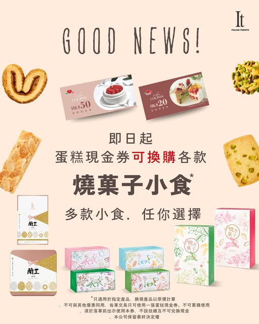 即日起,手上Italian Tomato蛋糕現金券可以換購各款人氣燒菓子!不論係最新開心果蝴蝶酥、杜拜朱古力曲奇,定係皇牌蘭王蛋卷,通通可以用現金券換!