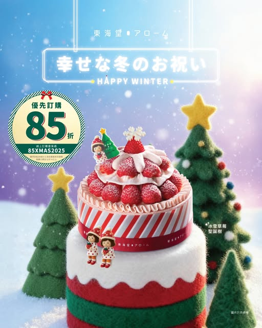 凡於12月14日或之前,蒞臨門市或網上(輸入優惠碼「85XMAS2025」)預訂$239或以上之指定聖誕系列蛋糕,即享優先訂購85折優惠