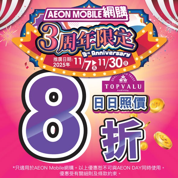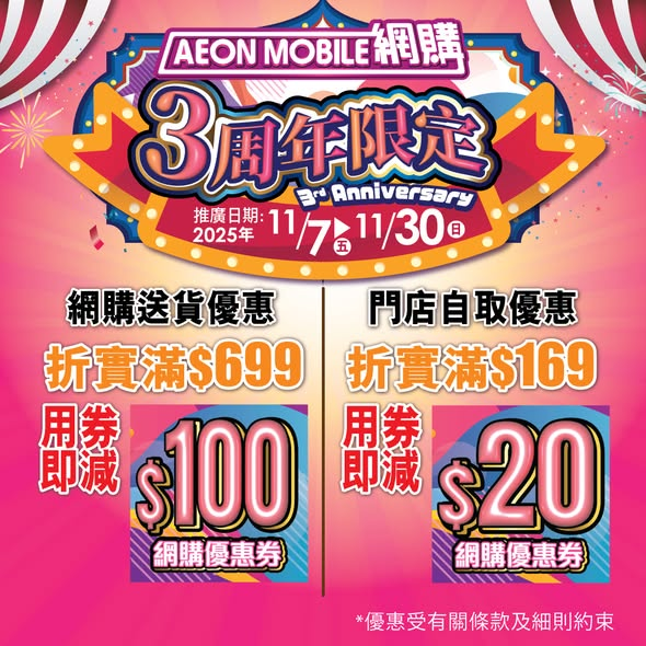 「AEON Mobile網購3周年」推廣期為即日至2025年11月 30日 ,