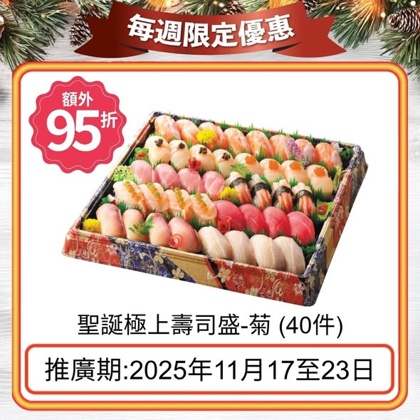 每周精選菜式可享再9折,今個星期精選菜式係:聖誕極上壽司盛-菊 (40件),推廣期為即日至2025年11月23日
