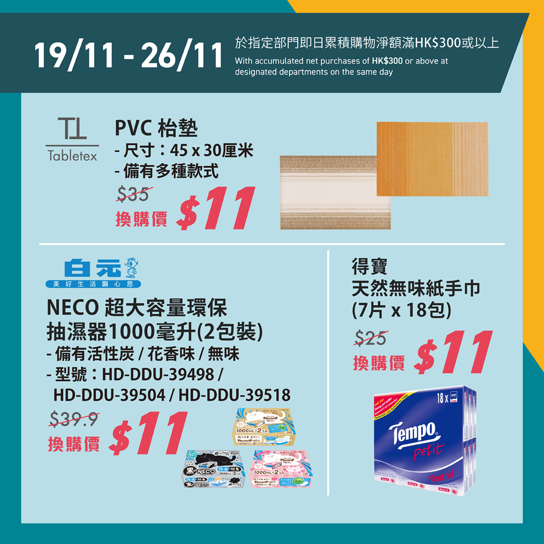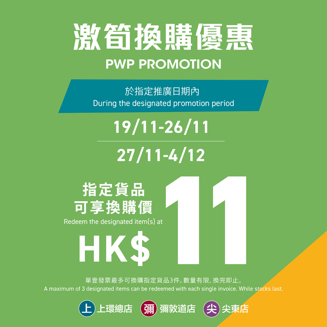 $11激筍換購優惠】即日起至2025年12月4日,凡於指定部門即日累積購物淨額滿$300或以上,即可以$11換購指定貨品
