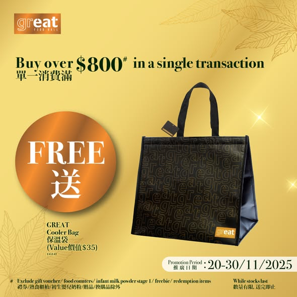 於GREAT消費滿$800送GREAT 保溫袋乙個(價值$35)**優惠期至 30/11/2025。以上優惠只適用於FOOD PARC 及GREAT,並不適用於百佳旗下的其他超市品牌、數碼港商場3樓及新鮮食品優惠並不適用於TASTE x FRESH