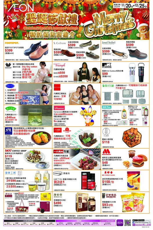 【聖誕節獻禮 特許銷售商推介】今個聖誕,特許銷售商推出「聖誕節獻禮 特許銷售商推介」,當中包括#餐飲優惠 、#內衣優惠 、#休閒鞋履 等優惠!大家mark實日期拎盡優惠啦~ 「聖誕節獻禮 特許銷售商推介」 推廣日期︰即日至12月25日**詳細請參考網站海報內容或宣傳單張 24小時網上日式超市及更多網購資訊盡在 : https://www.aeoncity.com.hk/