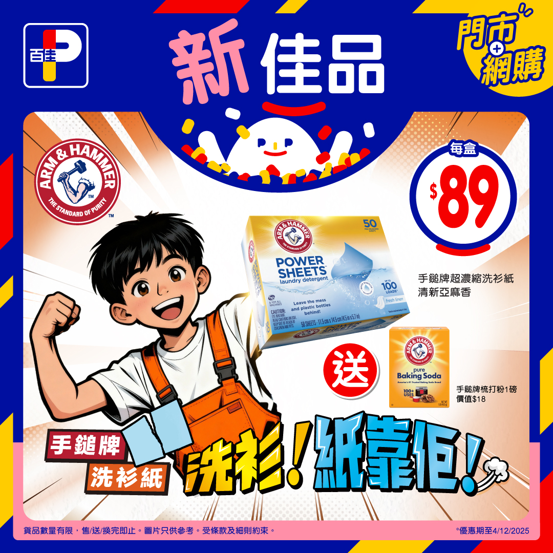*優惠期至4/12/2025,以上優惠適用於大部分香港百佳、FUSION、TASTE、INTERNATIONAL及PNS網購有售,並不適用於百佳旗下的其他超市品牌、數碼港商場3樓及百佳快閃特賣埸。貨品數量有限,售/送/換完即止。圖片只供參考。 受條款及細則約束。贈品/換購品/原箱優惠除外。以每張發票計算。