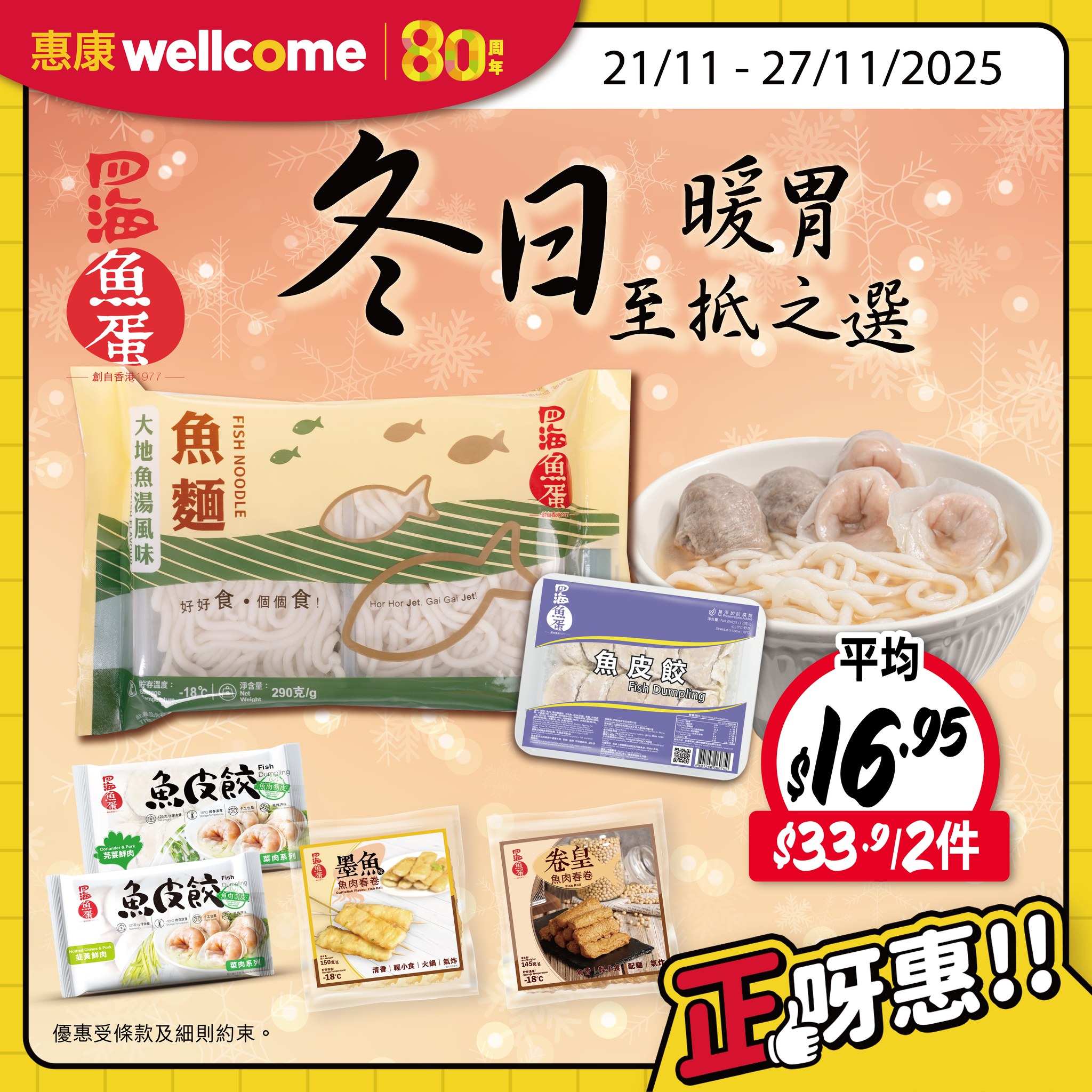 四海 大地魚湯魚麵/魚皮餃/卷皇魚肉春卷/墨魚味魚肉春卷/韭黃鮮肉魚皮餃/芫荽鮮肉魚皮餃 優惠價$33.9/2件, 平均$16.95/件四海大地魚湯風味魚麵湯底鮮甜,配上手工包製嘅魚皮餃,簡直係冬日幸福暖胃組合!