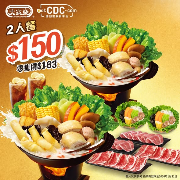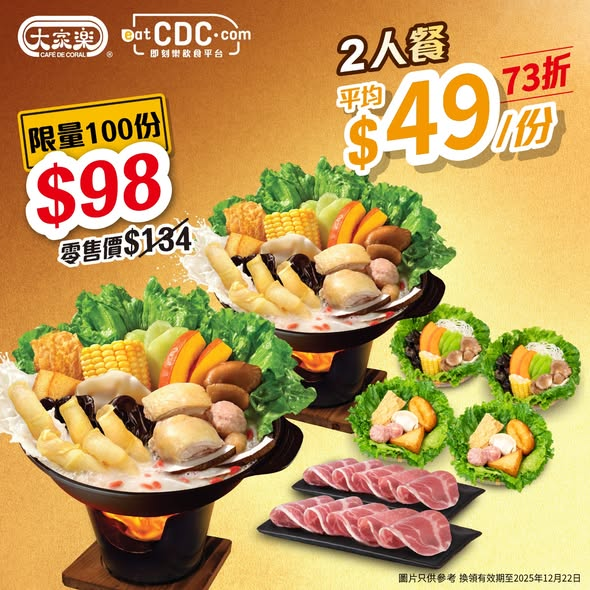 最啱就係食番個花膠椰子雞珍補鍋暖身!大家樂eatCDC推出黑色星期五快閃優惠,除咗有$98起嘅超抵二人餐券外,仲有豐富堅料任你揀~ 買2套指定火鍋餐券,仲送多碟肉同豬肉丸加料!11月25日中午12點開售!到時記得上eatCDC搶購喇~