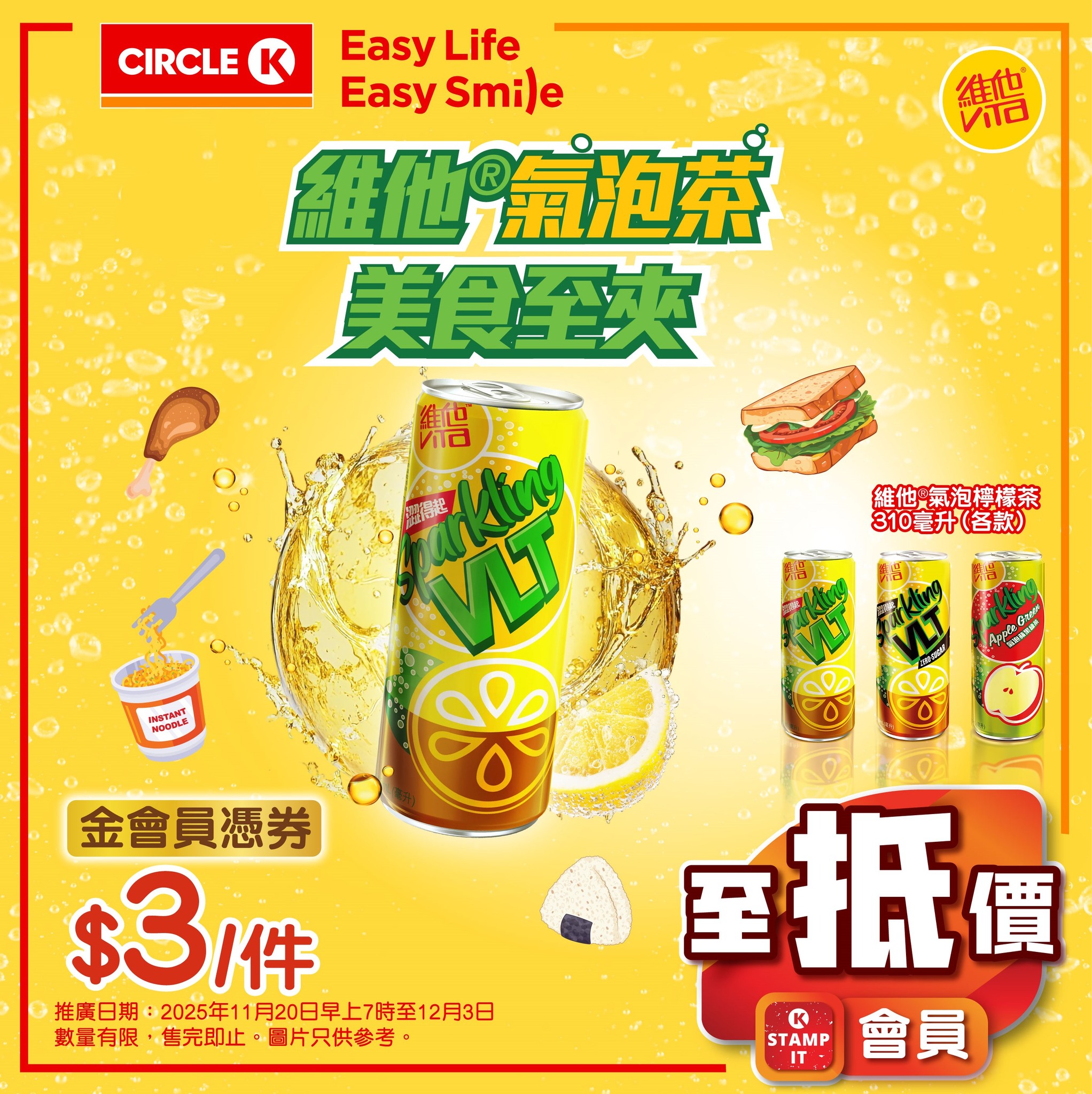 由即日起至12月3日,金會員憑券可以$3購買維他®氣泡茶310毫升 (各款)一件,詳情請查閱〔優惠券〕欄。