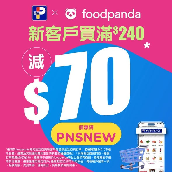 *適用於foodpanda指定生活百貨新客戶的首張生活百貨訂單,並須買滿$240(不連平台費、運費及其他適用費用並計算折扣及優惠券後);只限指定商店門市,每張訂單最高折扣為$70,優惠或不適用於foodpanda平台上的所有商品,特定商品不適用於此優惠;優惠僅適用指定用戶; 優惠期至2025年11月30日,每個帳戶限用一次,名額有限,先到先得,送完即止。受條款及細則約束。