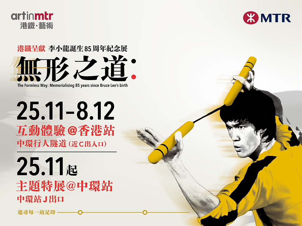 今年是傳奇巨星李小龍誕生八十五周年,港鐵公司聯同李小龍基金會及香港 文化博物館,由十一月二十五日起舉辦《李小龍誕生85周年紀念展:無 形之道》,展現這位成長於香港的一代宗師在電影、武術、哲學及藝術的深厚思 想和內涵。乘客可以在日常旅程中,探索李小龍影響後世之「無形之道」,以平 等、尊重、共融為日常修行之法,領悟一代武術傳奇如何突破界限、連接世界, 並在現今社會中持續啟發人心。