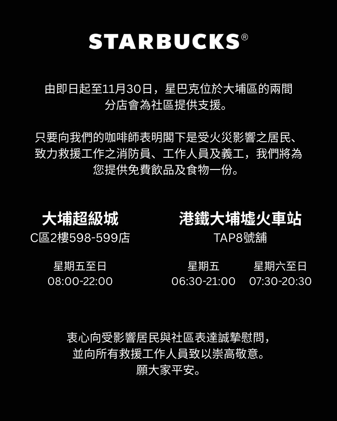 From today until November 30, our two Starbucks stores in Tai Po District are dedicated to supporting the community during this difficult time.