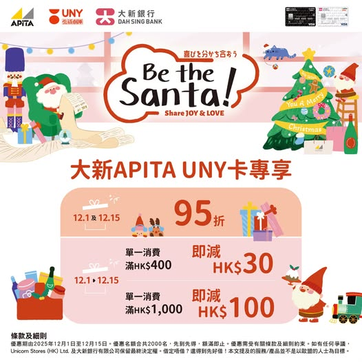 【#UNY信用卡優惠 APITA UNY感謝日!大新卡專享高達$100即時折扣】由即日起至12月15日,顧客凡於APITA及UNY憑大新APITA UNY卡消費,單一簽賬滿$400或以上,可享$30即時折扣;單一消費滿$1,000,即時折扣更加碼至$100!12月1、15日更可同時享有恆常95折優惠,多重獎賞,萬勿錯過,記得把握機會入手聖誕主題好物!了解優惠詳情及條款:https://bit.ly/4rosW5F—一APP盡享會員儲分、獎賞兌換及網購體驗, 立即下載CU APP:https://bmai.cc/4p7cku
