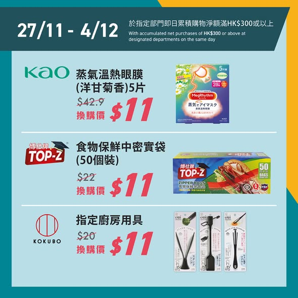 $11激筍換購優惠】即日起至2025年12月4日,凡於指定部門即日累積購物淨額滿$300或以上,即可以$11換購指定貨品