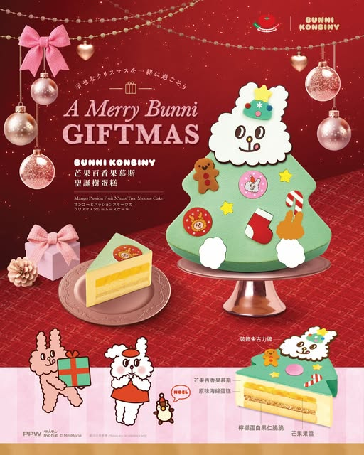 「Bunni Konbiny 芒果百香果慕斯聖誕樹蛋糕」慕斯蛋糕以清新的芒果百香果口味為主,夾藏著香甜的芒果果醬與檸檬脆脆,讓每一口都如同拆開驚喜的禮物,伴隨著清新的檸檬香氣,撲面而來!