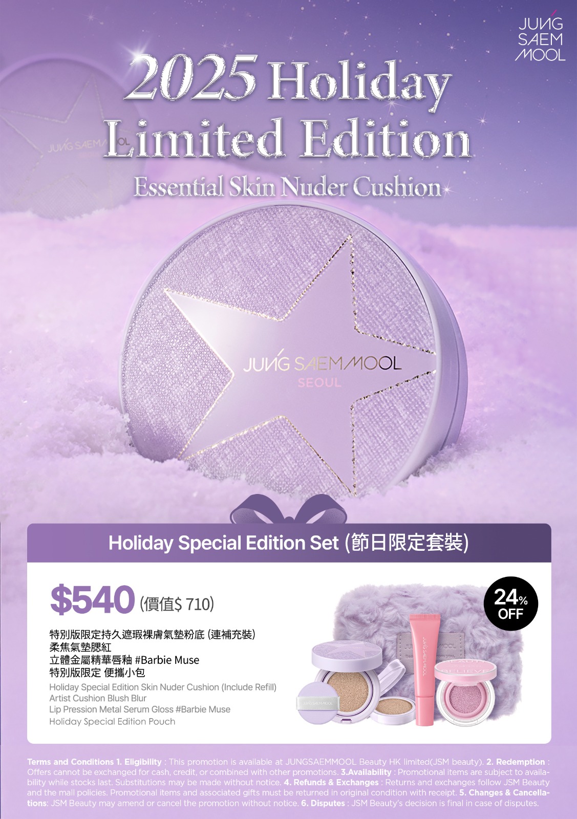 作為JSM Beauty皇牌產品「持久遮瑕裸膚氣墊粉底」一直以來其輕盈貼膚不假面,持久不乾燥的裸肌效果深受喜愛,之後更蟬聯2024年Olive Young及化解(HwaHae)美妝大獎氣墊產品類第一名。今次推出的2025年特別版套裝,除了推出聖誕限定包裝的氣墊粉底外,更額外附贈柔焦氣墊腮紅、立體金屬精華唇釉#Barbie Muse,以及節日限定便攜小包,打造從底妝至妝彩的完整節日妝容。