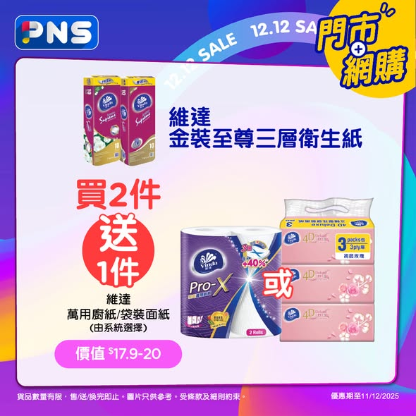 維達金裝至尊三層衛生紙買2件,送維達萬用廚紙/袋裝面紙(款式由系統選擇,價值$17.9-$20)「12GIFT」及「12CNC」優惠期至2025年12月10日。