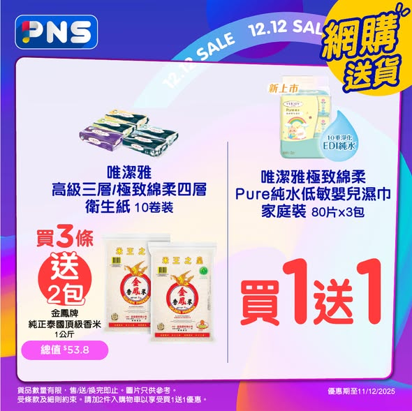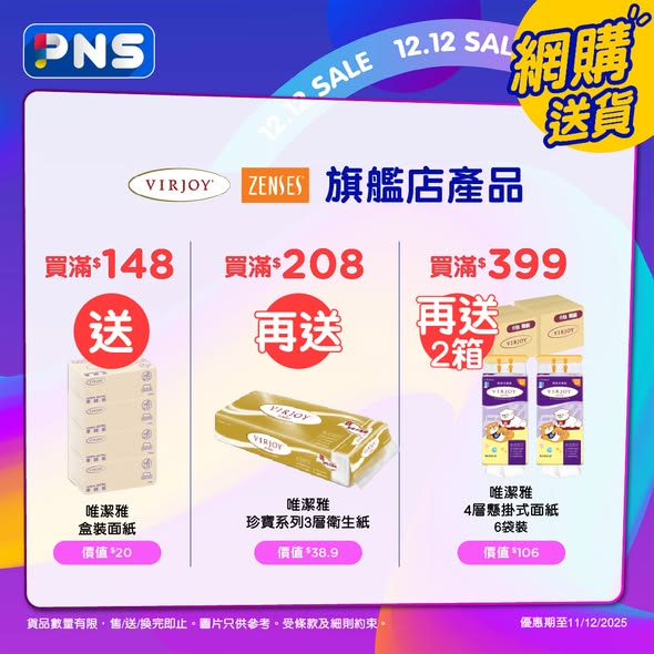買滿$208,再送唯潔雅珍寶系列3層衛生紙(價值$38.9)