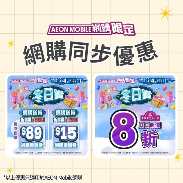 網購優惠券領取及使用日期為即日至2025年12月11日^AEON網購啟德店除外