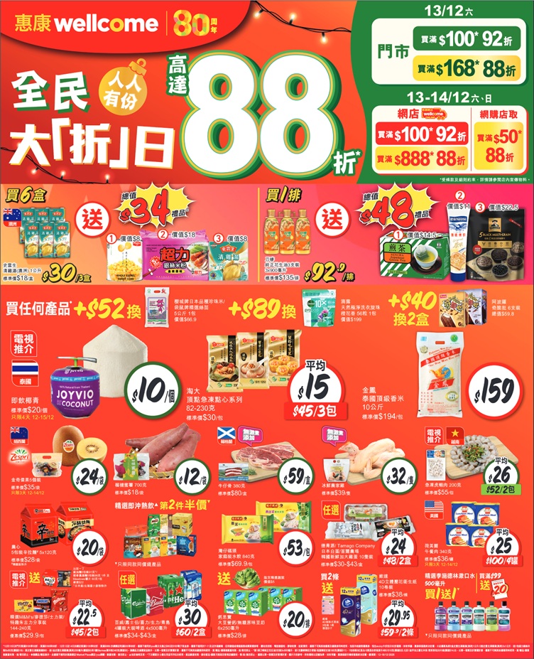 *12月13日於門市買滿$100享92折, 買滿$168享88折。12月13至14日於網店買滿$100享92折,買滿$888/於網購店取滿$50享88折。優惠不適用於yuu積分兑換之$80及$165電子現金券。優惠不適用於7-11及店外展銷場、任何儲值或增值服務或購買禮券等、嬰幼兒奶粉、電話儲值咭、膠袋收費、 送貨費用。優惠不可與其他優惠及優惠券同時使用,包括內地遊客優惠劵、恒生enJoy卡折扣日92折優惠。 如有爭議,惠康保留最終決定權。