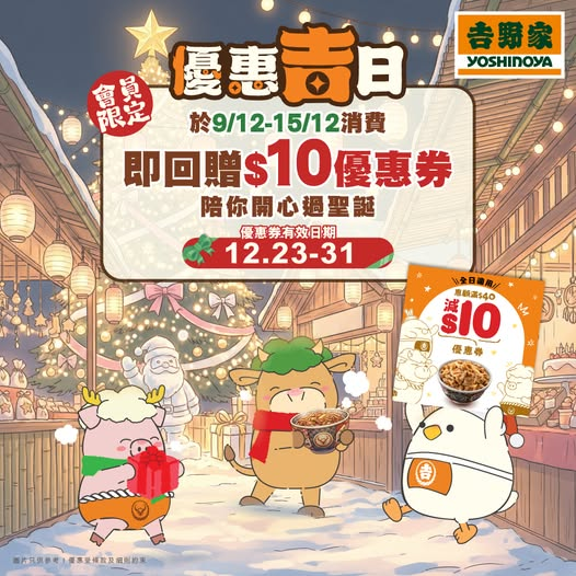 聖誕優惠吉日!陪你開心過節!】即日起至 15/12,喺香港吉野家任意消費,即送「滿$40減$10」電子優惠券一張!
