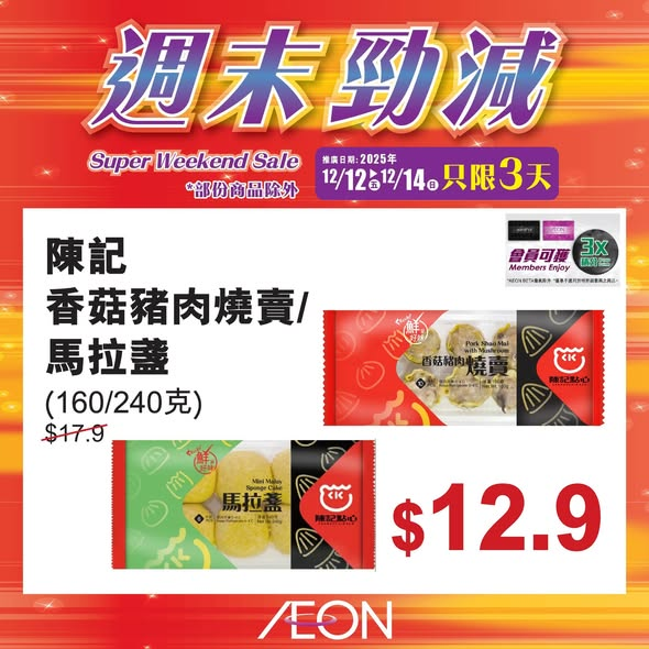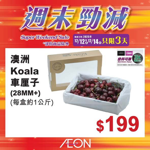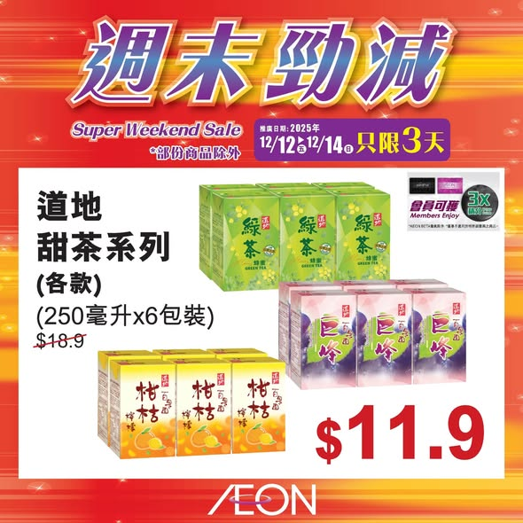 【今個週末有乜著數?!】即日起至12月14日舉行嘅週末勁減精選多款熱賣商品特價發售!即刻㩒入嚟睇吓有咩筍貨啦! 「週末勁減」推廣日期:2025年12月12日至12月14日推廣地點:全線AEON*以上推廣活動須受有關條款及細則約束,詳情請參閱店內海報/向店內職員查詢。