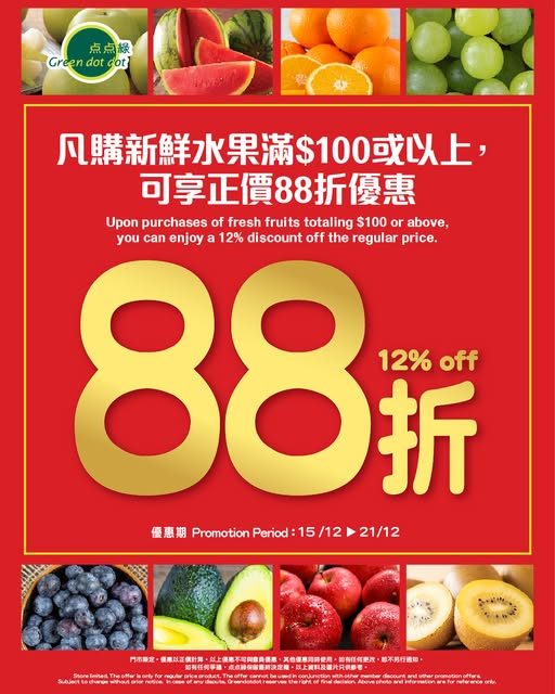 【限時優惠 |折快閃優惠 】点点綠門市今期返左好多新解靚水果,送禮自用都適宜,買任何新鮮水果滿$100或以上,可享正價88折優惠! #有機富士蘋果脆爽多汁,無添加果蠟,安心連皮食 #秋月梨清甜爽口 #蜜橙汁豐無渣 #秘魯藍莓飽滿多汁 #澳洲HASS牛油果奶油般軟滑口感仲有其他水果,款款都咁高質,唔好錯過,立即到門市選購 優惠期:2025年12月15日12月至21日#門市限定