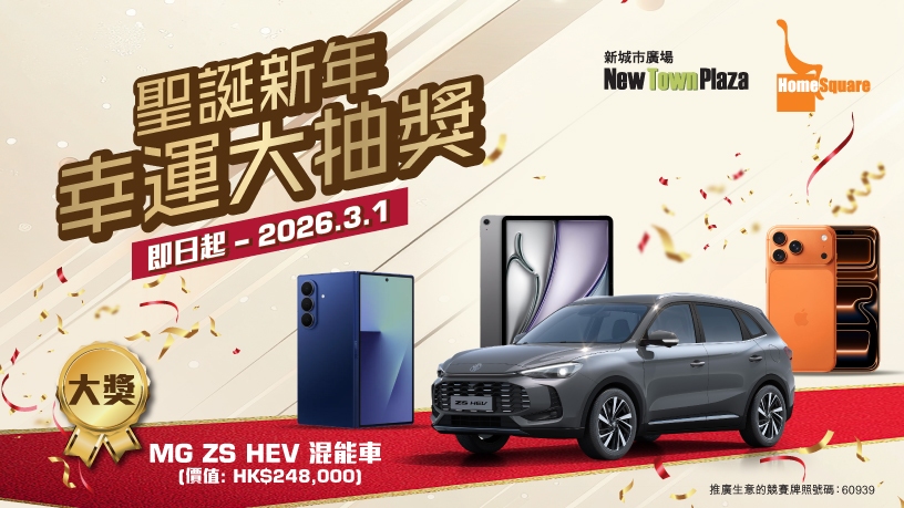 當然少不了壓軸登場的「聖誕新年幸運大抽獎」,即日起至 2026 年 3 月 1 日於新城市廣場或 HomeSquare 「即賺分」的商戶,每張即日電子單據消費滿 HK$500 即可登記積分及獲得抽獎機會 1次,每張單最多獲 10 次抽獎機會,獲抽中的幸運兒有機會獨得 MG ZS HEC 混能車、 iPhone 17 Pro Max 512GB 及 Samsung Galaxy Z Fold 7等,快寫下今年聖誕購物 check list ,入手心頭好,把握機會贏大獎!