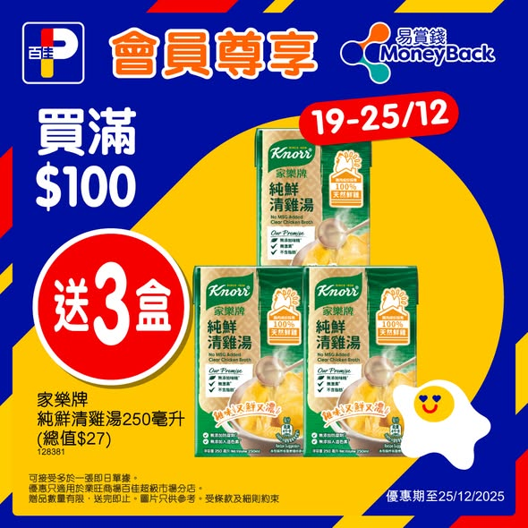 滿$100送 家樂牌純鮮清雞湯250毫升3盒*