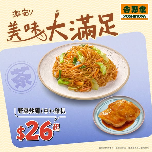 野菜炒麵(中)+雞扒 $26起*圖片只供參考 | 早午茶市供應 | 只限指定分店 | 餐種及飲品供應以個別分店為準| 優惠受條款及細則約束