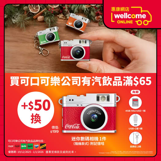 獨家換購!依家嚟惠康網店買可口可樂公司有汽產品滿$65,即可以加+$50換領迷你數碼相機1件(隨機款式)!仲包埋SD card,可以即開即用