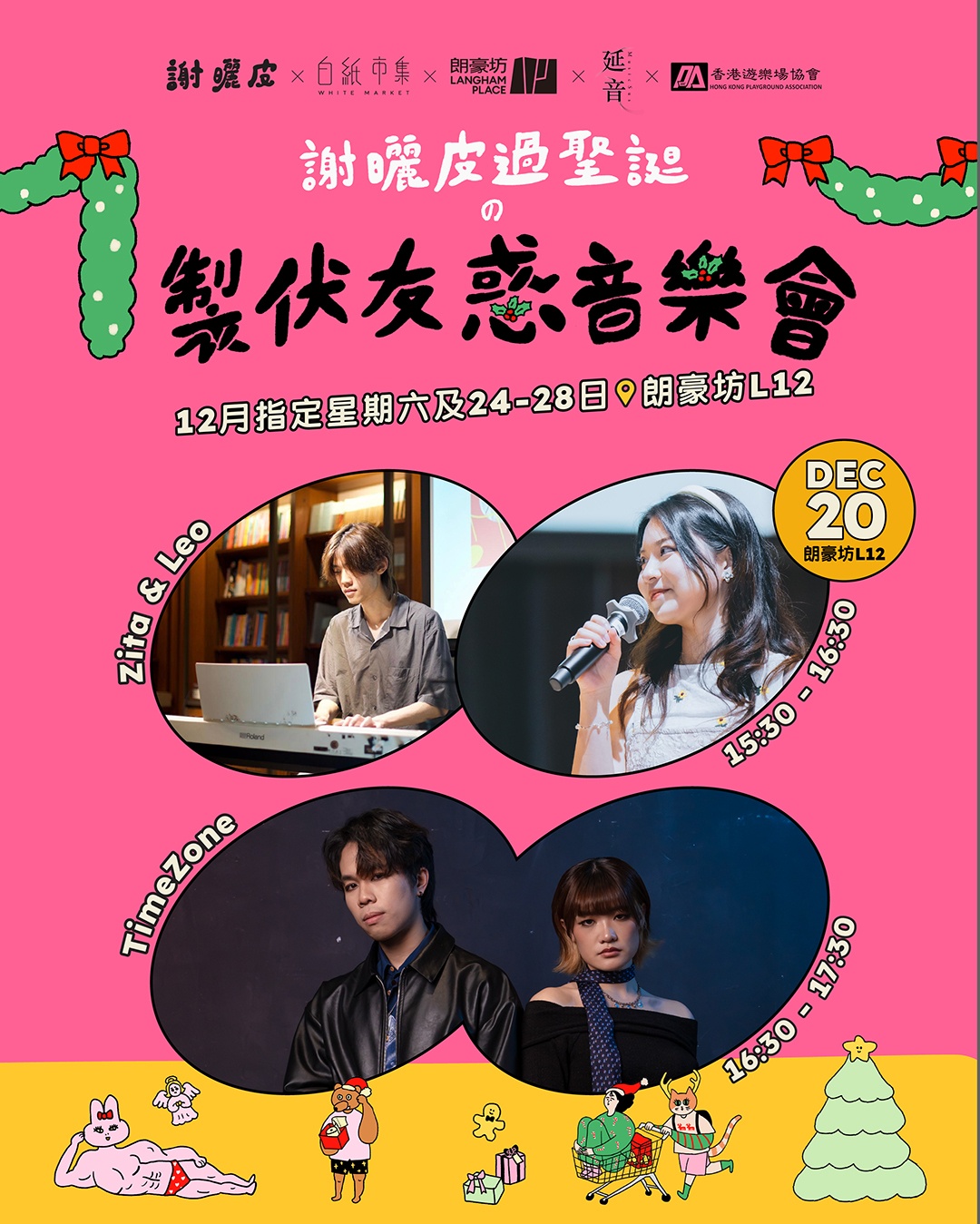 朗豪坊 L12 LIVE Stage 一直是培育本地音樂人的重要舞台。今個聖誕節,朗豪坊特別聯同香港遊樂場協會《延音 MusicSUS 青少年街頭音樂表演擴展計劃》,呈獻多場《謝曬皮過聖誕之製伏友惑音樂會》。12 樓舞台將於12月20日、24日至28日,由年青歌手及樂隊輪流演出,演繹流行曲及聖誕歌,為大家送上溫暖節日祝福。