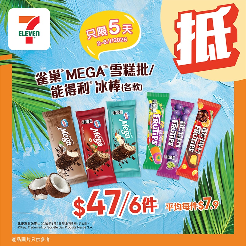*優惠有效期由2026年1月2日早上7時至1月6日。優惠只適用於香港店舖。部分貨品只限於指定店舖提供。貨品數量有限,售完即止。如有爭議,所有價格以個別店舖為準。貨品圖片只供參考。就一切有關事宜,7-Eleven將保留最終之決定權。