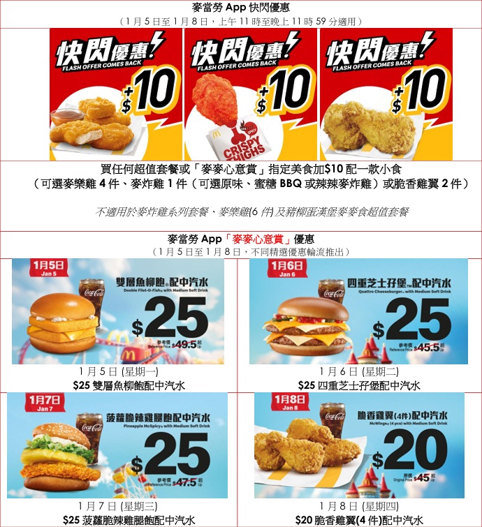 App用戶凡選購任何超值套餐,例如巨無霸、板燒雞腿飽、脆香雞翼、芝士安格斯超值套餐等,或現正熱賣的「麥麥心意賞」優惠:包括即日供應的$25雙層魚柳飽配中汽水、1月6 日登場的菠蘿脆辣雞腿飽配中汽水、1月7日提供的四重芝士孖堡配中汽水或1月8日壓軸出場的$20脆香雞翼(4件)配中汽水,均可加$10即歎麥樂雞4件、麥炸雞1件(可選原味、蜜糖BBQ或辣辣麥炸雞)或脆香雞翼2件,讓大家以麥當勞皇牌炸雞美食慶祝,寓意2026新一年滿載「脆」味!大家記得把握機會,以優惠價加配小食。同時,多款人氣著數優惠,包括$14魚柳飽、$15.5豬柳漢堡、$16麥香雞繼續供應,一系列麥當勞美食任您選。