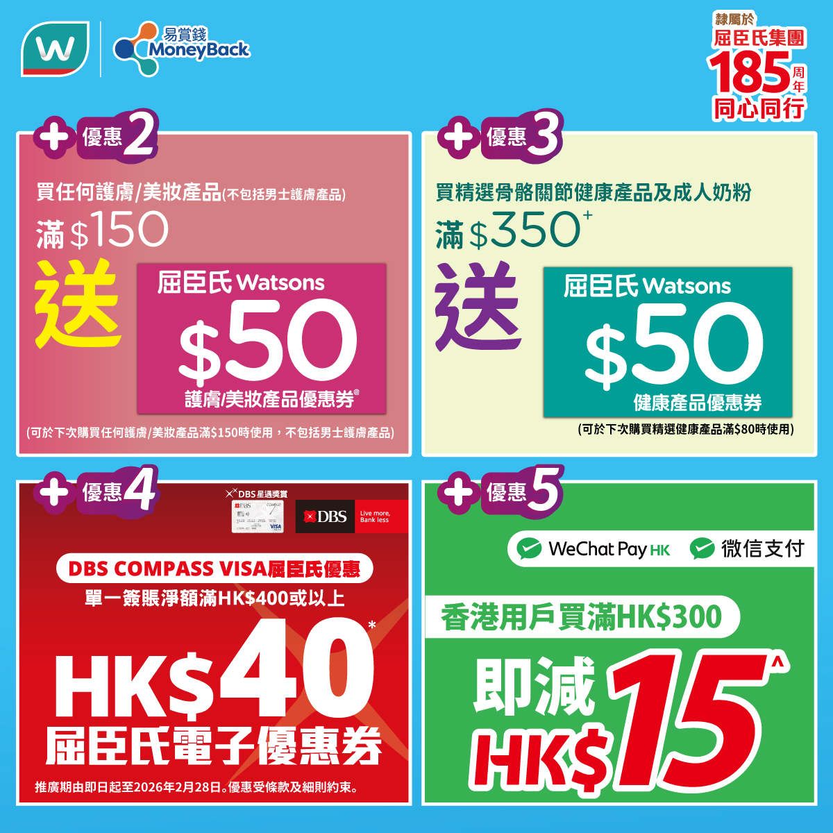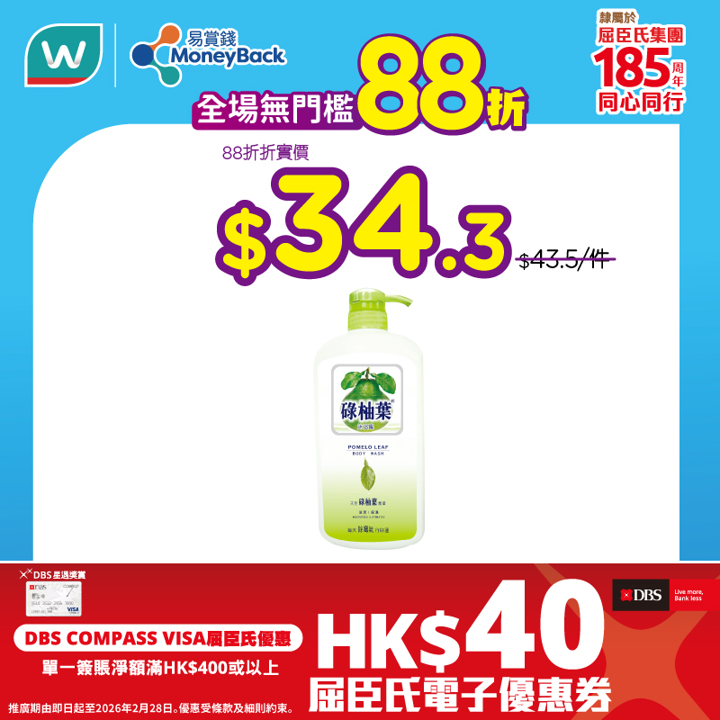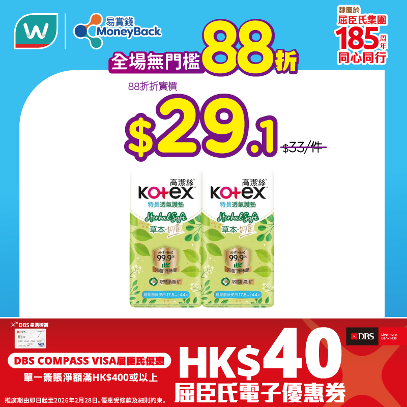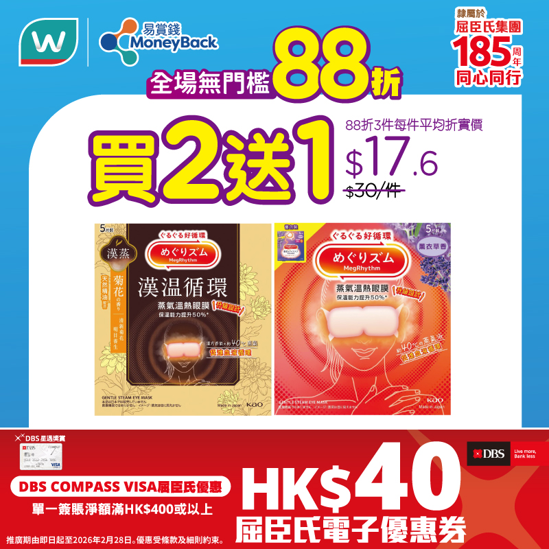 *優惠只適用於同時為「易賞錢」會員的DBS COMPASS VISA持卡人, 於付款前必須掃瞄「易賞錢」App或登入屈臣氏網店,並以DBS COMPASS VISA簽賬以獲享屈臣氏電子優惠券。優惠名額先到先得,額滿即止。若優惠名額已滿,將於商戶門市/網店及/或推廣網頁公佈。於門市結賬時,持卡人必須於完成付款前告知商戶員工欲使用優惠。交易一經確認,恕不補發或追溯相關優惠。優惠不適用於自助收銀機。以綁定DBS COMPASS VISA的電子錢包(於屈臣氏門市以 Apple Pay、Google Pay、Samsung Pay 付款的簽賬除外)完成的交易不能獲享優惠。每位持卡人於推廣期內每月可享優惠最多一次,推廣期內合共最多兩次。透過屈臣氏門市所獲享之電子優惠券會於簽賬後14個工作天內自動加入持卡人的「易賞錢」賬戶內。透過屈臣氏網店或屈臣氏手機App所獲享之電子優惠券會於完成送貨後14個工作天內自動加入持卡人的「易賞錢」賬戶內。電子優惠券有效期至2026年3月31日及只供下次惠顧時使用。