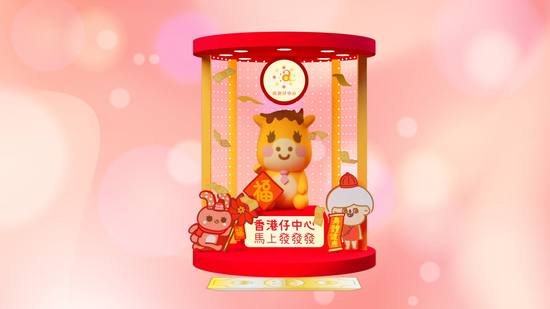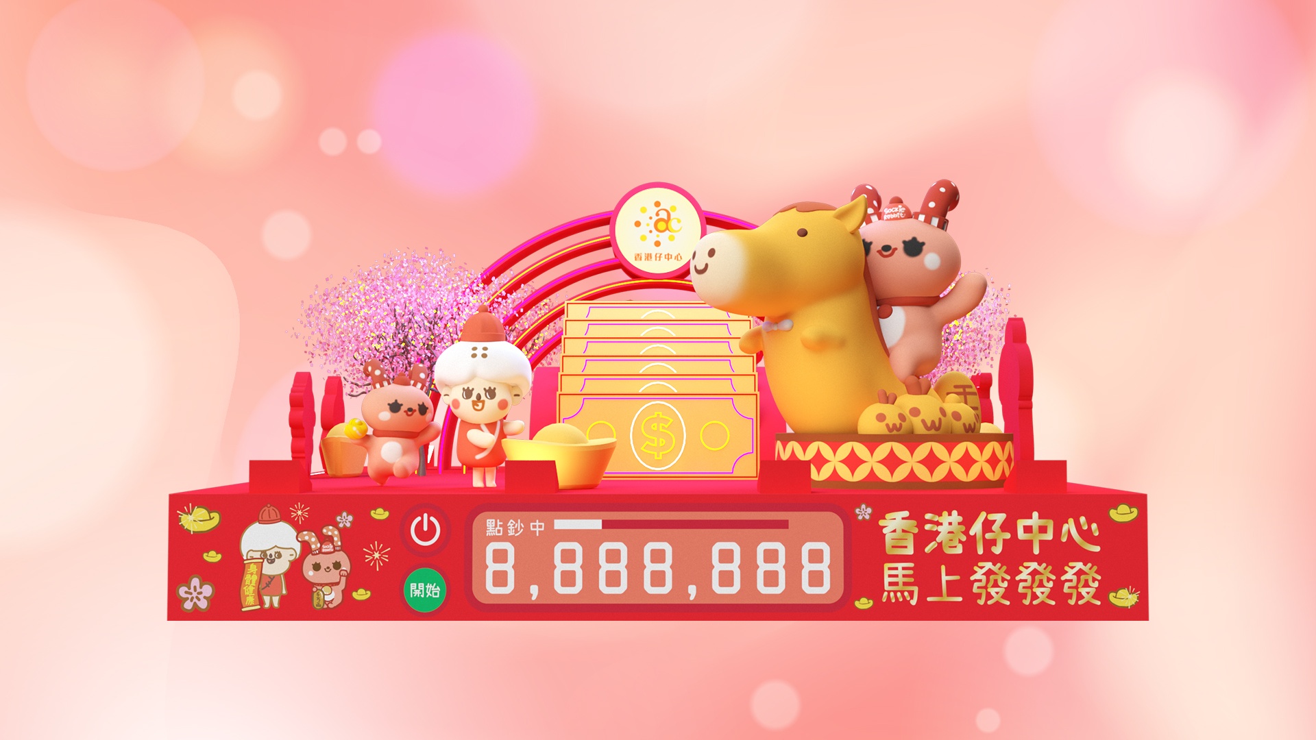 馬年當然祈求馬運昌隆,人財兩旺,香港仔中心特設2大招財打卡位,讓大家新年行大運!當中最特別要數「馬上發發發點鈔機」,巨型小襪兔邊騎招財馬邊祝大家來年萬馬奔騰,財運如河滾滾而來;可愛溫柔小襪兔女孩和幽默的胡老太更手握元寶,象徵橫財就手,祝大家馬年事事如意;於小襪兔身後的桃花樹轉轉保證來年人緣及姻緣運勢旺盛;最後當然不少得點鈔機滿滿鈔票,寓意財運亨通,來年數錢數到手軟!下一站來到「現金馬上從天降」打卡位,招財馬同無數鈔票打造成天降橫財,祝願新一年財源滾滾來,盤滿缽滿!