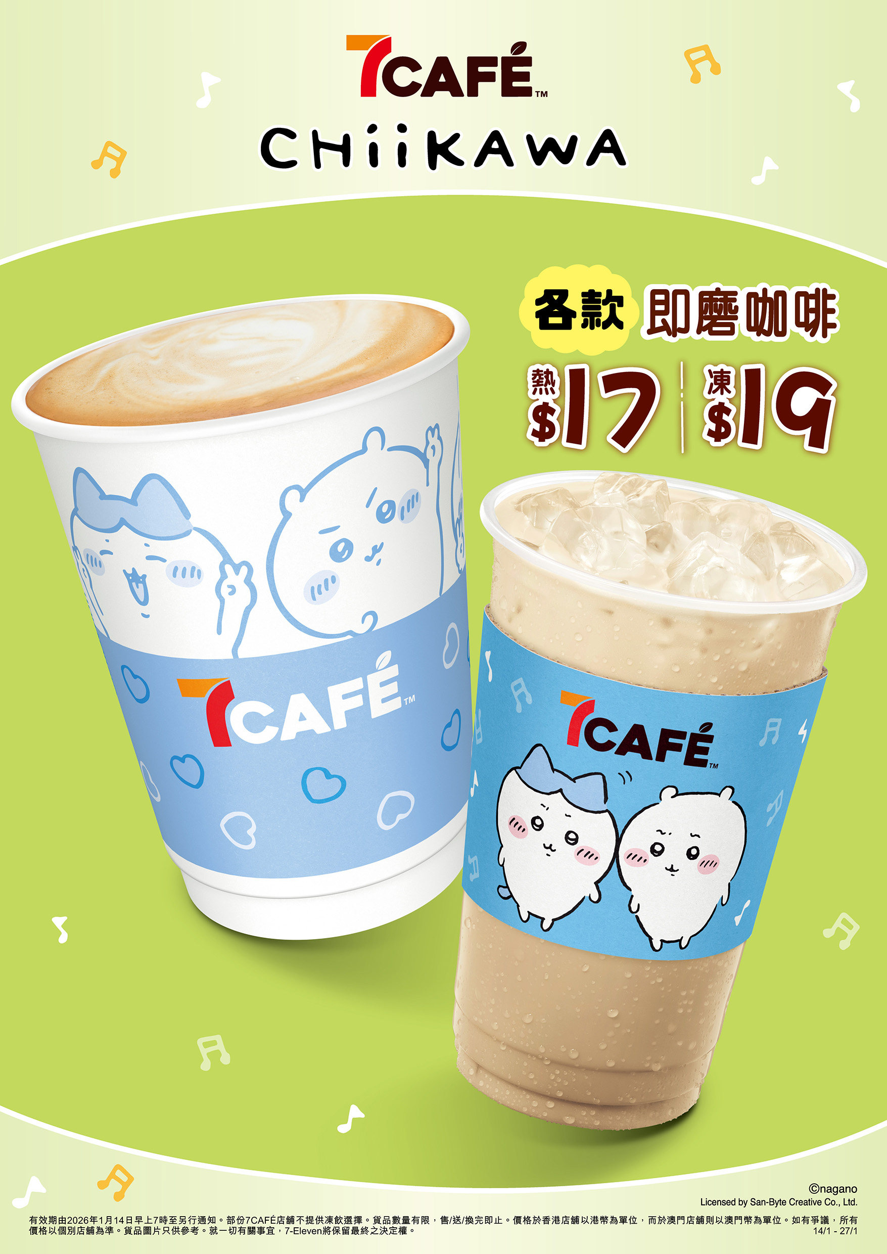 7-Eleven另一自家品牌 7CAFÉ 亦同步為熱飲及凍飲分別換上可愛、設計獨特的全新限定CHIIKAWA熱飲杯/凍飲杯套,讓你在享用7CAFÉ咖啡/飲品的同時,為你的日常注入滿滿元氣!首波2款7CAFÉ CHIIKAWA熱飲杯及凍飲杯套將於1月14日起登場,而下一波7CAFÉ CHIIKAWA限定熱飲杯/凍飲杯套更會在稍後時間推出, 詳情請留意7-Eleven 官方社交平台公佈。