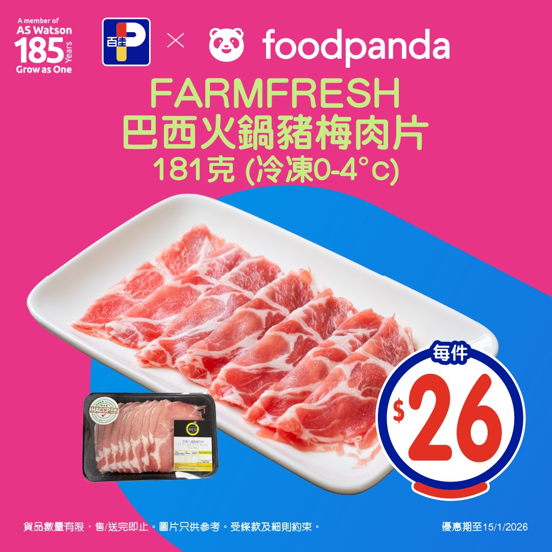 FARMFRESH巴西火鍋豬梅肉片181克,優惠價$26/件^送遞時間按實際情況而定。