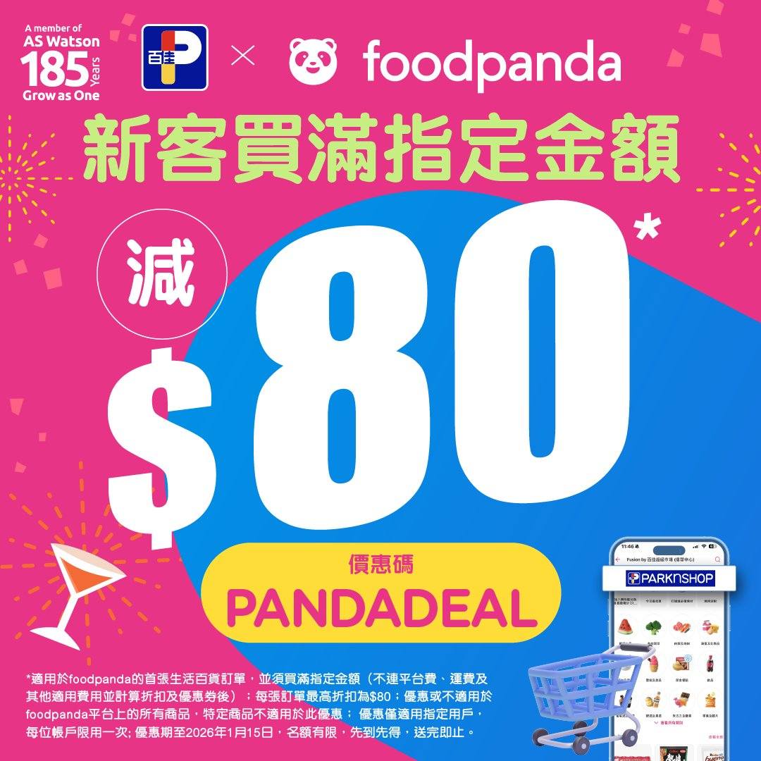 # 適用於foodpanda的首張生活百貨訂單,並須買滿指定金額(不連平台費、運費及其他適用費用並計算折扣及優惠券後);每張訂單最高折扣為$80;優惠或不適用於foodpanda平台上的所有商品,特定商品不適用於此優惠; 優惠僅適用指定用戶,每位帳戶限用一次; 優惠期至2026年1月15日,名額有限,先到先得,送完即止。