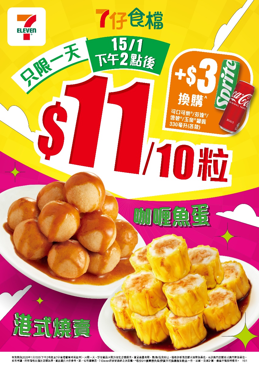 *有效期為2026年1月15日 (下午2時至個別店舖7仔食檔營業時間結束),只限一天。部份貨品只限於指定店舖提供。貨品數量有限,售/換/送完即止。如有爭議,所有價格以個別店舖為準。貨品圖片只供參考。優惠受條款及細則約束,詳情請參閱店內宣傳品。