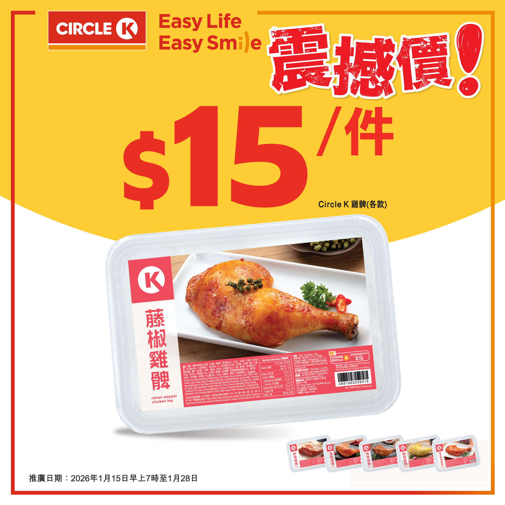 【只限兩星期震撼價優惠!】Circle K雞髀勁抵食每隻只需$15!.放工返到屋企,肚仔咕咕叫,諗起OK便利店嘅雞髀,香氣即刻浮現係腦海。無論係藤椒嘅麻香、秘製豉油嘅濃郁、定係韓式甜辣嘅刺激,每一隻都係握得到嘅幸福味道,滿足到爆!.由即日起,Circle K限時推出【雞髀震撼價】!以下多款口味任你揀都係$15/隻:藤椒雞髀秘製豉油雞髀惹味香辣雞至尊燒烤雞脾鹽焗雞脾韓式甜辣雞脾快啲嚟OK便利店入貨啦!.- 數量有限,售完即止。- 此優惠不可與其他優惠同時使用- 推廣日期: 2026年1月15日至28日.#OK便利店 #CircleK #雞髀 #震撼價 #抵食推介 #限時優惠 #Jetso