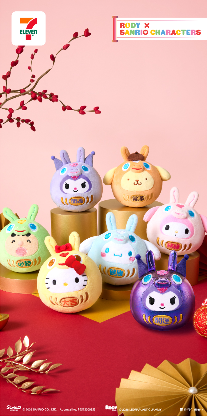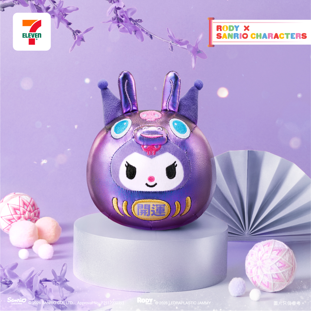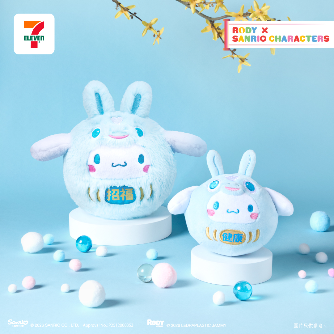 7-Eleven 應用程式限定版— 「15cm 郁郁耳Cinnamoroll」: Rody 跳跳馬頭套並印上「招福」的祝賀字亮相,象徵幸福與好運