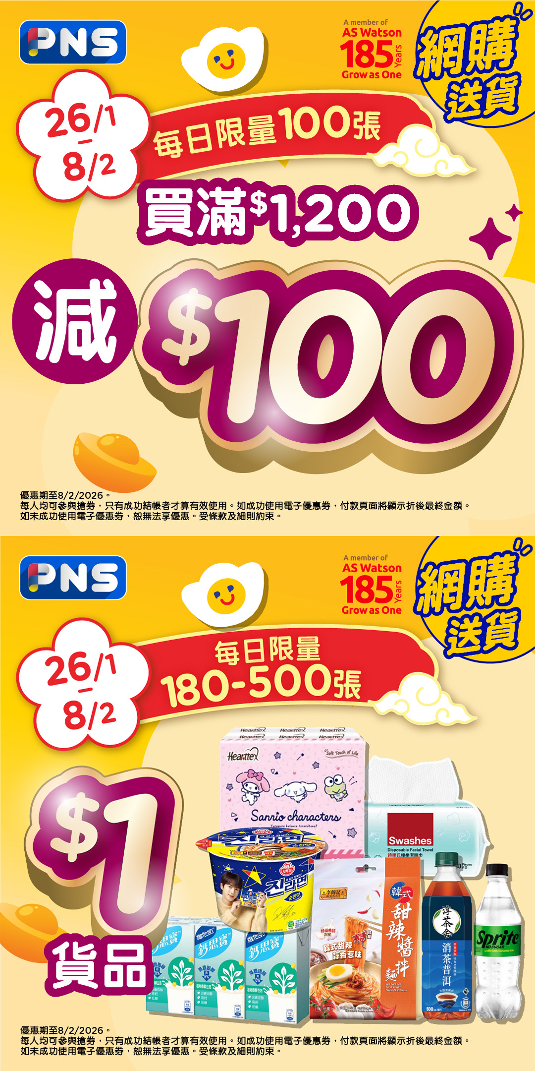 一連14日,#PNS網購 每日都派超過$200畀大家買年貨,$1就買到各款人氣產品喇