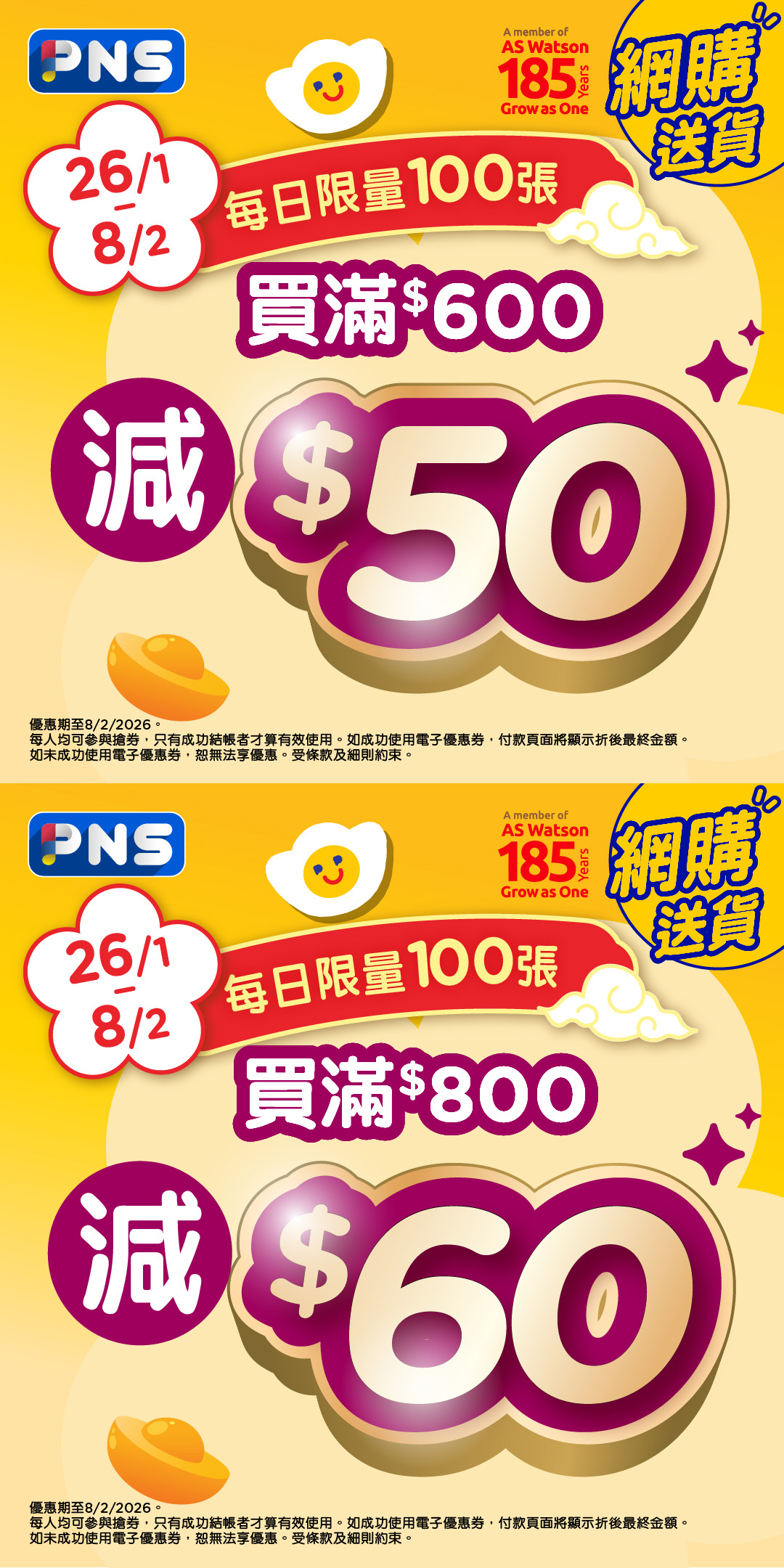 $60電子優惠券:買滿$800並使用網購送貨,即減$60