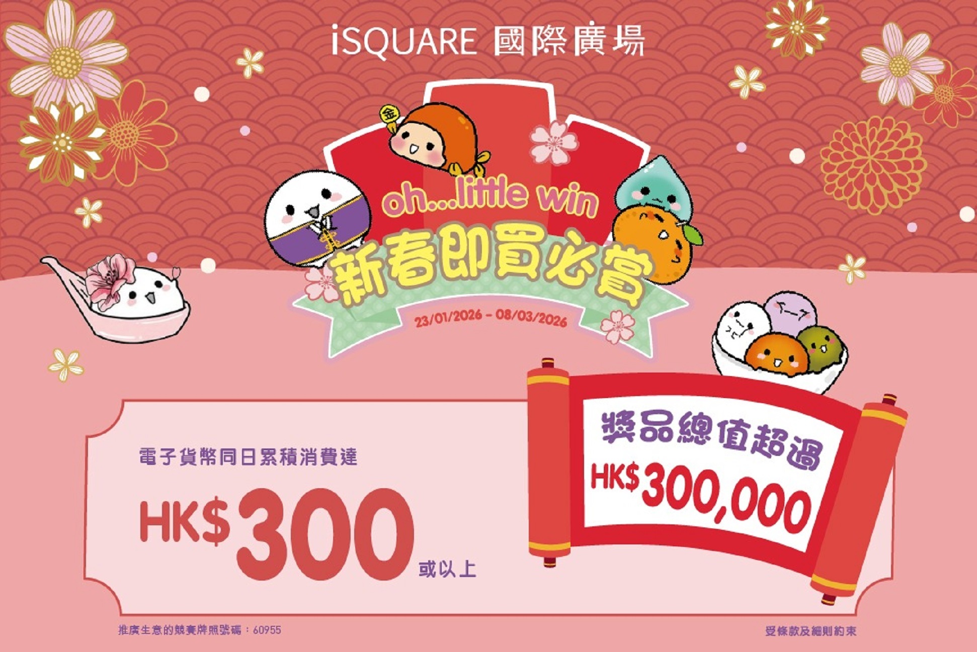 oh…little sweet 最愛跟大家一起分享甜蜜, 農曆新年iSQUARE國際廣場準備了「幸運甜頭」給各位顧客,推出【『oh…little win』新春即買必賞】。2026年1月23日至3月8日蒞臨iSQUARE國際廣場最多兩間不同商戶,以電子貨幣同日累積消費達港幣300元或以上,並成為iSQUARE國際廣場iCLUB會員及出示電子會員卡,即可參加【『oh…little win』新春即買必賞】乙次及賺取iCLUB會員積分。拆開即賞oh…little win 萬事大吉幸運卡,除了有插畫師波比的新年祝福語賀歲墨寶之外,同時亦有價值HK$25 iCOUPON現金券、價值HK$50(3樓、6樓及7樓食肆)iCOUPON現金券、價值HK$50(零售)iCOUPON現金券、價值HK$100(零售)iCOUPON現金券、價值HK$300 iCOUPON現金券或價值HK$900 iCOUPON現金券,吃飯、購物及看電影使用,愈消費愈好使!