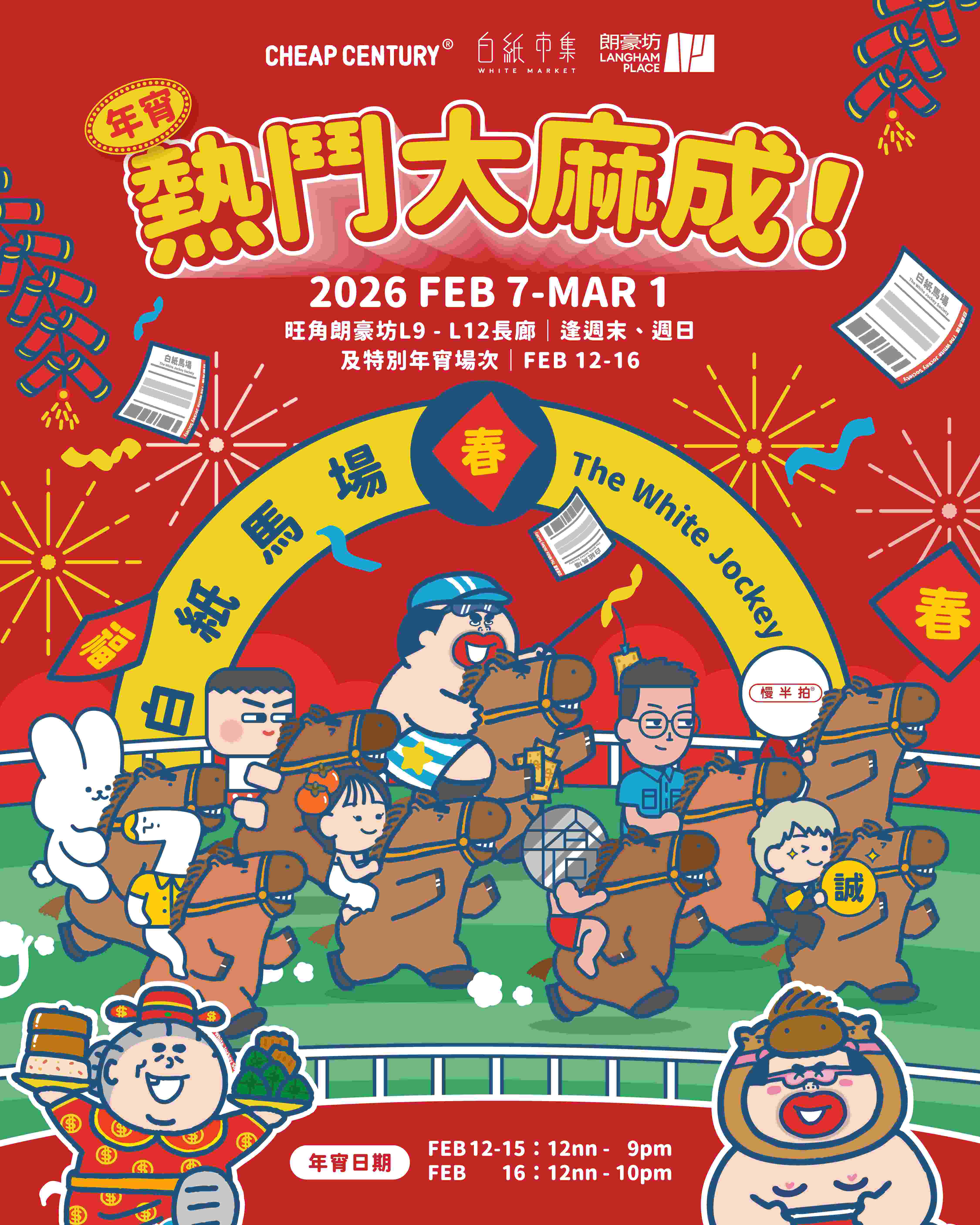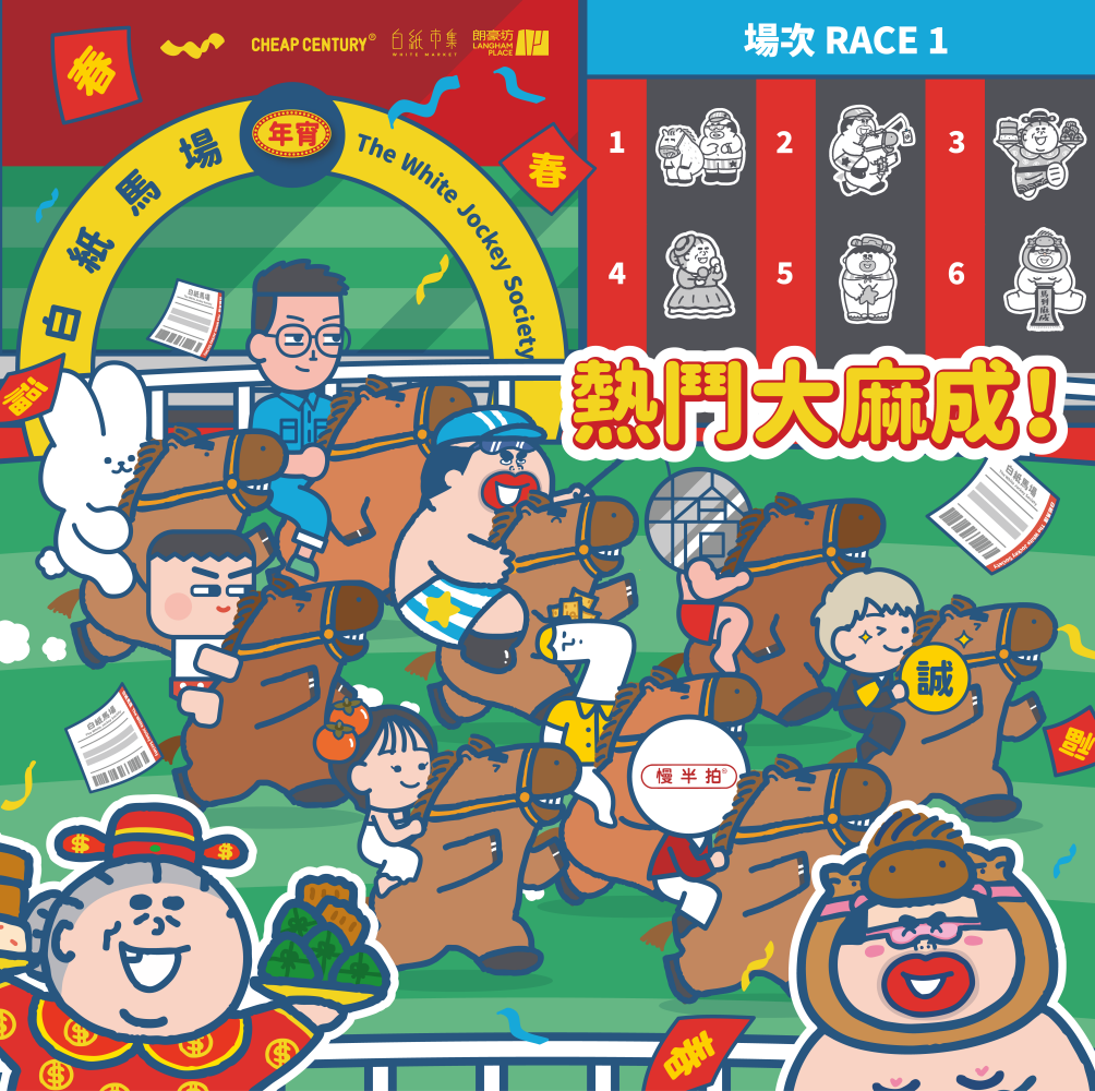 馬年開跑,創意年宵市集強勢登場!今年2 月朗豪坊與白紙市集再度聯乘人氣插畫家大麻成,於7至12樓以「熱鬥大麻成」為主題,為馬年新春注入滿滿潮玩活力與互動體驗。市集設計靈感取材自「馬場」,由「白紙馬經」宣傳單張、多個檔口以投注櫃台為設計概念,配合大麻成「馬場賽事直播」插畫,還原馬場的熱鬧場景。