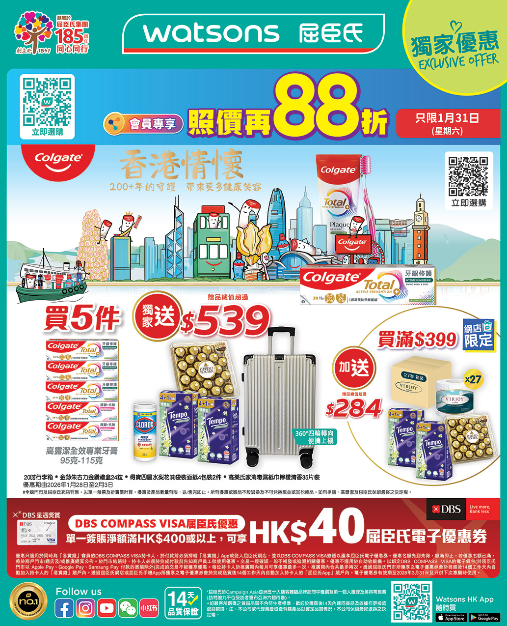 用DBS COMPASS VISA單一簽帳淨額滿HK$400或以上,可享HK$40屈臣氏電子優惠券▲