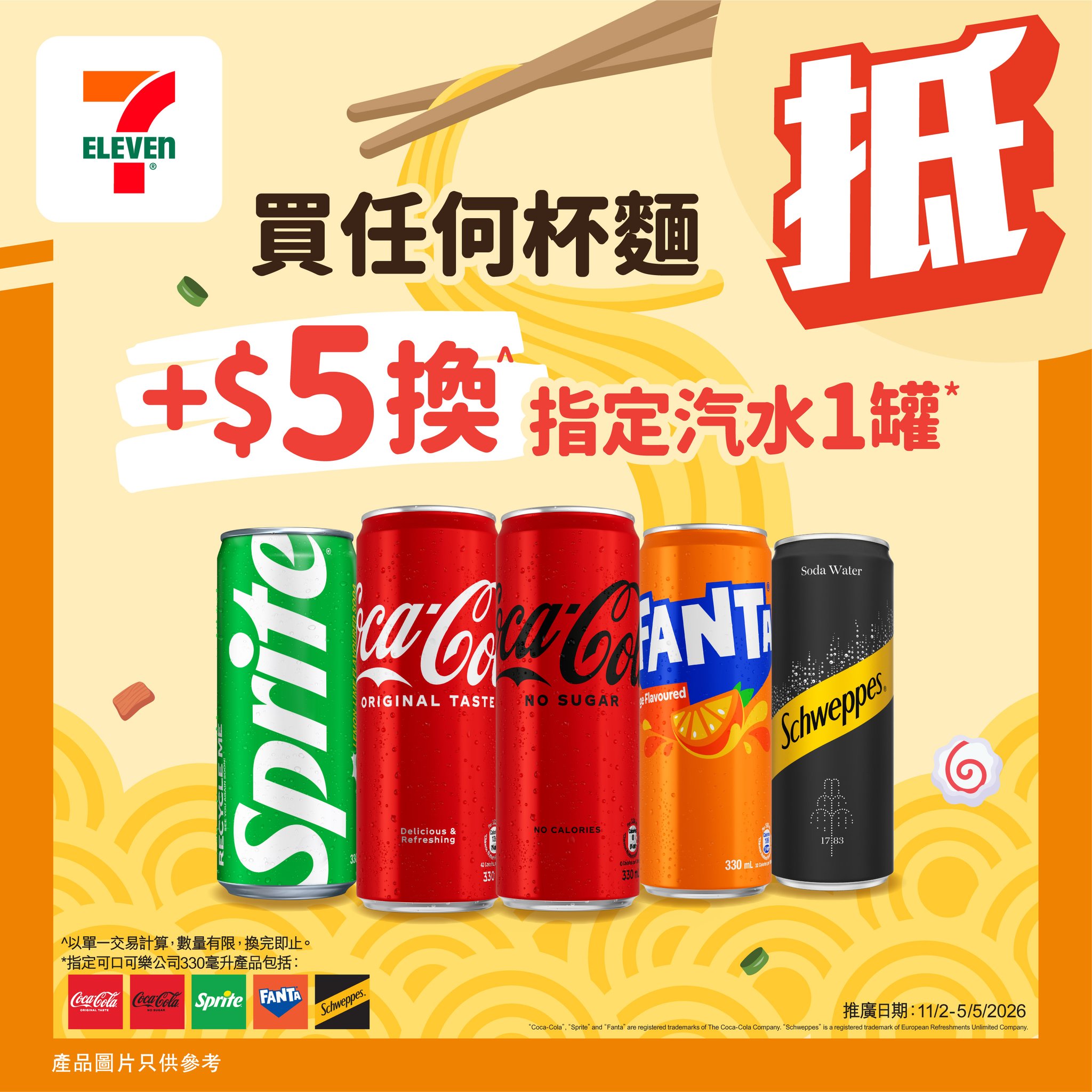 由即日起至5月5日嚟7仔購買任何杯面1件,即可+ $5換購指定汽水^1罐*!
