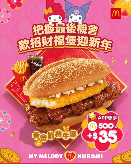 【招財福堡系列最後召集! App會員專享積分加$35立即歎黃金脆薯牛堡餐!】過年梗係要有香港人專屬嘅新年儀式感:歎節日限定嘅招財福堡系列!今年都要歎返餐攞個好意頭!求財運嘅朋友,最啱歎黃金脆薯牛堡餐,馬年必定多福又多金~今個星期開App落單,用分加$35就可以歎到,仲有靚靚 My Melody 同 Kuromi包裝添!最後倒數階段,千祈唔好錯過呀!#招財福堡系列 #黃金脆薯牛 #麥當勞App #新年限定 #麥當勞 #imlovinit