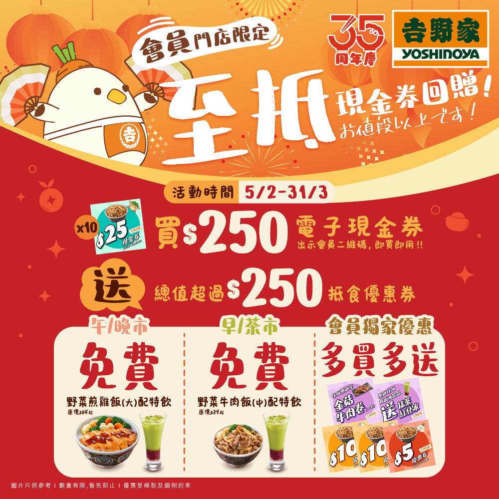 【買$250送$250!吉野家至抵現金券套裝隆重登場!】