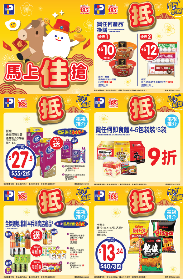 *優惠至26/2/2026。以上優惠適用於大部分香港百佳、FUSION、TASTE、INTERNATIONAL 有售,並不適用於百佳旗下的其他超市品牌、數碼港商場 3 樓、百佳快閃特賣埸及新鮮食品優惠並不適用於 TASTE x FRESH 新鮮生活之店舖。貨品數量有限,售/送/換完即止。圖片只供參考。受條款及細則約束。以每張發票計算。 # 散裝麵/原箱優惠/急凍及冷凍食品/贈品/換購品除外